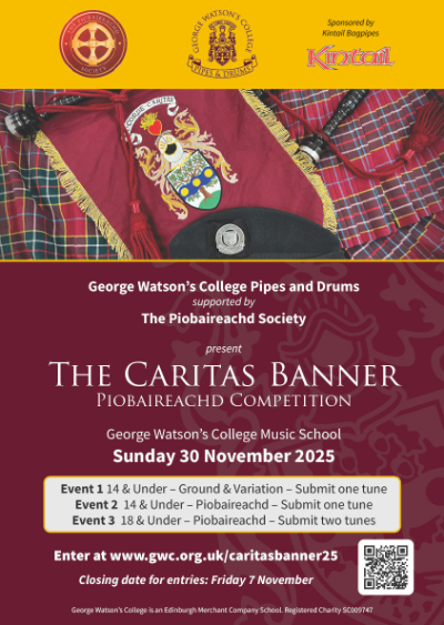 We are pleased to announce that entries for the Caritas Banner are now open, writes Ben Duncan. The competition, aimed at promoting the study and performance of piobaireachd in young pipers will run for its third year on Sunday, 30th November 2025 at George Watson’s College, Edinburgh.