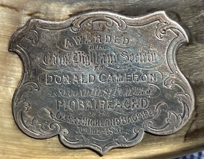 ‘Awarded by the Edin. Highland Society to Donald Cameron, second best player of Piobaireachd on the Great Highland Bagpipe, 31st of July 1857.’ One wonders what the best player received.