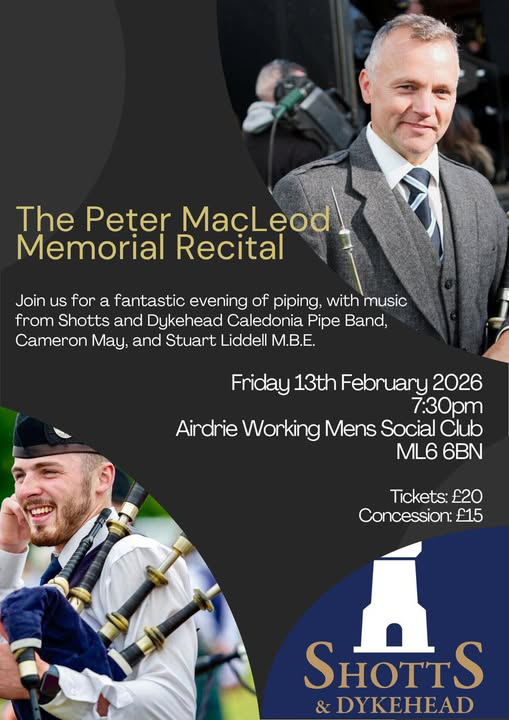 A recital headlining Champion Piper Stuart Liddell is to be held early next year. The venue is Airdrie Working Men’s Club in Lanarkshire. The date is Friday, February 13.