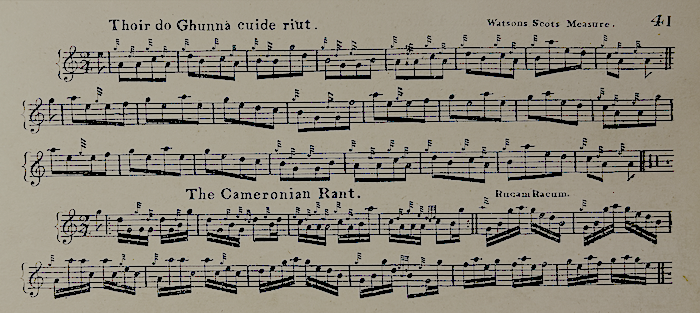 In both books tunes that we know today as multi-part ‘competition’ pieces are shown in their infant, two-measure, form. Here for example are the Cameronian Rant and Bogan Lochan: