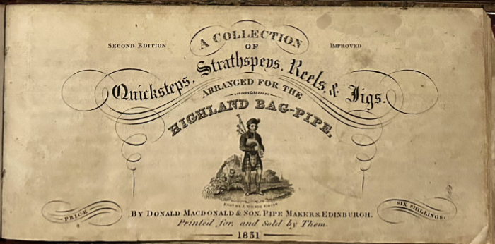 The Donald MacDonald collection of 88 ‘Quicksteps, Strathspeys, Reels and Jigs’ is marked and dated Edinburgh, 1831, and priced six shillings.