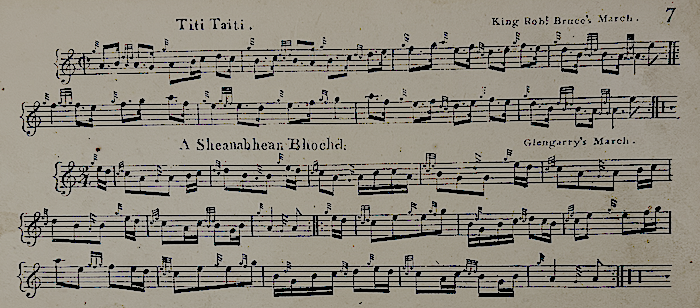 The first tune is ‘Titi Taiti’ [sic] which we know as Scots Wha’ Hae, after R Burns, and its subtitle is given as ‘King Robt. Bruce’s March’: