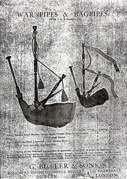 Stephen Beattie: ‘I’m seeking clarification on the wording of a piece of text in an advert in Lt. G de M H Orpen Palmer’s book ‘Irish Airs for the War Pipes’. The page in question is shown below: