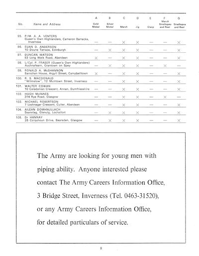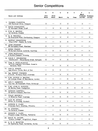 The Northern Meeting 47 years ago was split over two main halls: the Dr Black Upper Hall and the Caledonian Hotel Ballroom, with the Old High Church Hall for the juniors. 105 senior pipers and 38 juniors entered, all masterminded brilliantly by Piping Convenor Lt Col DJS Murray.