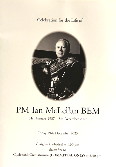 A very dignified service for Ian at Glasgow Cathedral last Friday with a large gathering from the piping and pipe band worlds. The eulogy was read by his son-in-law John Wallace and he lightened the sad occasion with a story of Ian and Evelyn Glennie. The renowned percussionist came into the Band Room shop in Glasgow where Ian worked with Joe Noble. She asked about piping lessons: