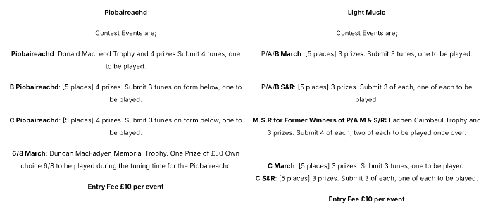 President Logan Tannock has announced that the entry form for this year’s competition is now available. The competition is on April 11 in the Piping Centre, McPhater Street, Glasgow. Here are the events: