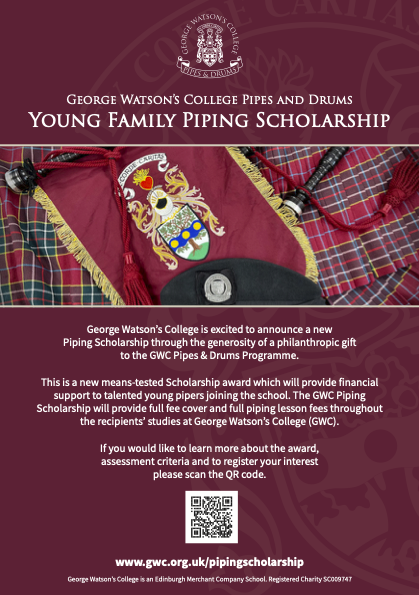 Ben writes, ‘George Watson’s College is pleased to announce the launch of a full piping scholarship. As outlined in the flyer below, the scholarship will be means-tested and will cover full school fees and piping tuition. We welcome candidates to apply via the QR code on the flyer.