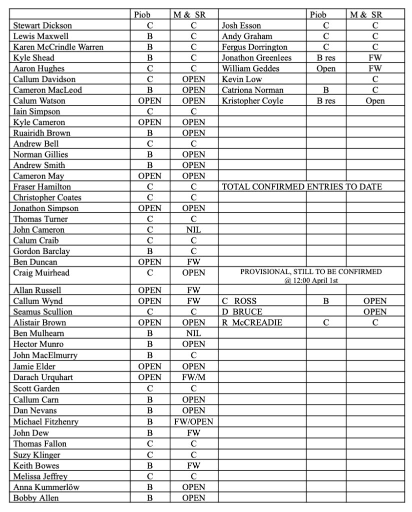 We ran the list of judges for the forthcoming Scottish Pipers Professional yesterday, now here are the pipers:
