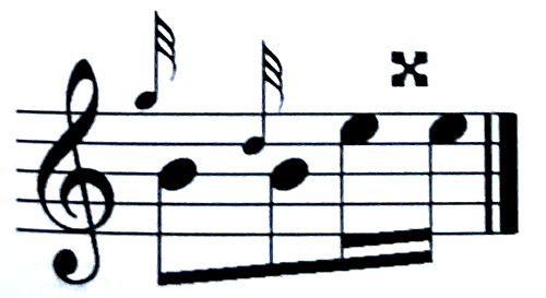 …..and the Piob. Soc. old version is not too far away depicting it as per the first example in this article. MacKay clearly did not intend the first two Bs to be played as a doubling, though the first two notes could be timed more evenly, without my preferred pointing on the first note. And Angus may have intended the dre, represented by a small cross in his MS, to have been played on low A, but I doubt this.